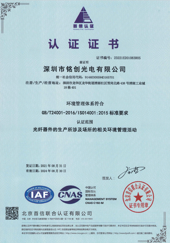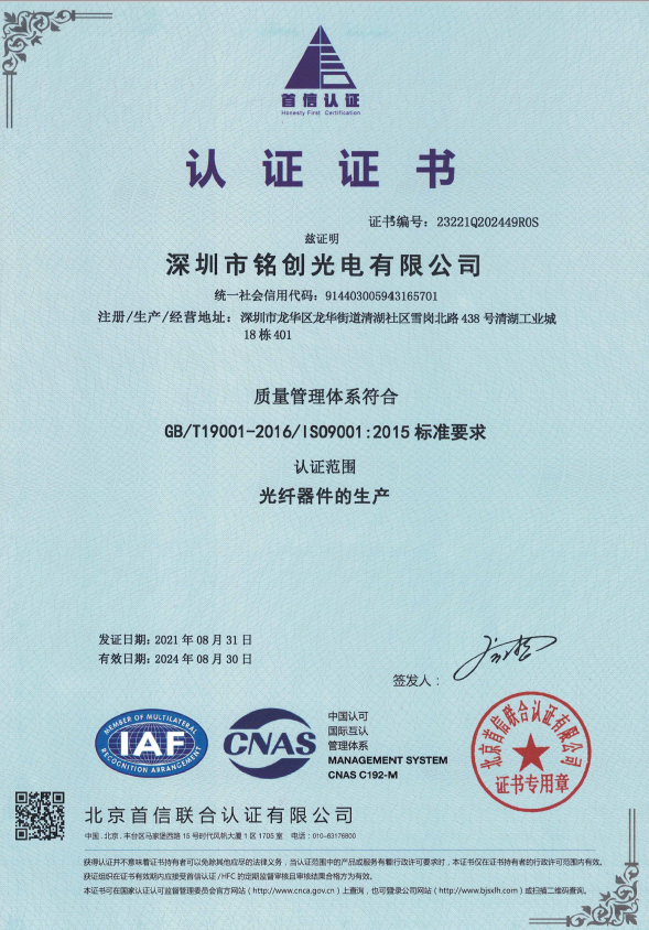 深圳市銘創光電有限公司于2012年成立,公司總部位于深圳市龍華區,是一家國家級高新技術企業,通過了IS09001-2015質量管理體系認證和IS014001-2015環境管理體系認證;經過多年的持續研發投入和專注發展,銘創光電已逐漸成為光纖激光器、光纖傳感、激光雷達和激光通信等領域的綜合性產品服務商。 公司目前設立有光無源器件研發生產中心和激光研發生產中心。無源器件研發生產中心設有有高標準的無塵車間,可提供各種波長的無源光纖器件、高功率光纖器件、保偏光纖產品、超小型光纖器件。激光研發中心建立在安徽合肥市,研發生產特殊波長的激光光源、光纖激光器、光纖放大器以及新產品的技術研究儲備。研發生產中心與多地科研單位合作,能夠迅捷高效的為客戶提供相